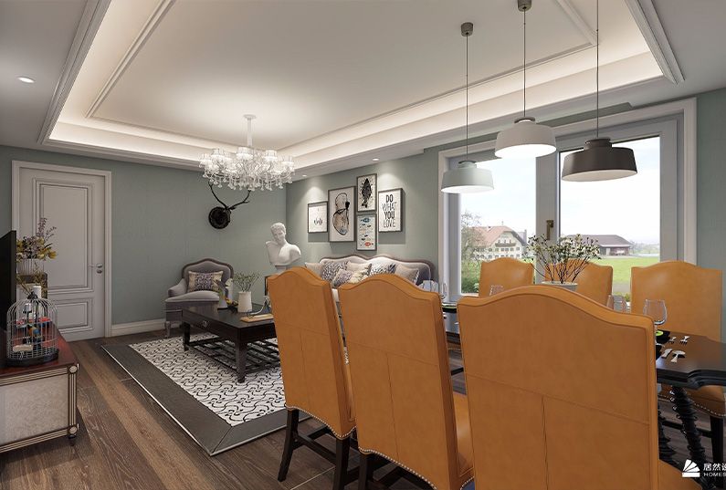 本案是一套美式简约家居,客厅的设计简约大气、线条洗练,淡色系墙面、天花板、沙发与深色系的茶几、墙纸相得益彰,赋予空间平衡之美 ;摒弃一切烦琐和奢华,去掉零碎的空间划分,去掉堆砌的颜色和摆设,去掉繁复设计的家具,但整个空间看起来,却又简而不凡。