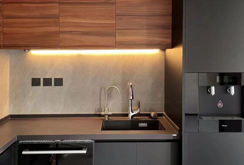 将原来狭长的厨房隔墙拆掉,扩宽扩高门洞,使其变成开放式厨房,在家用电器的选择上均选用高品质的大牌产品来配合橱柜的时尚简洁设计,设置了联动推拉门,在视觉上使客餐厨融为一处。没有采用时下流行的长虹玻璃改用灰玻,反而将客户想要的质感更加提升了一个等级。在吊柜下方增设的暖光照明灯,带给酷感十足的厨房浓浓的氛围感。