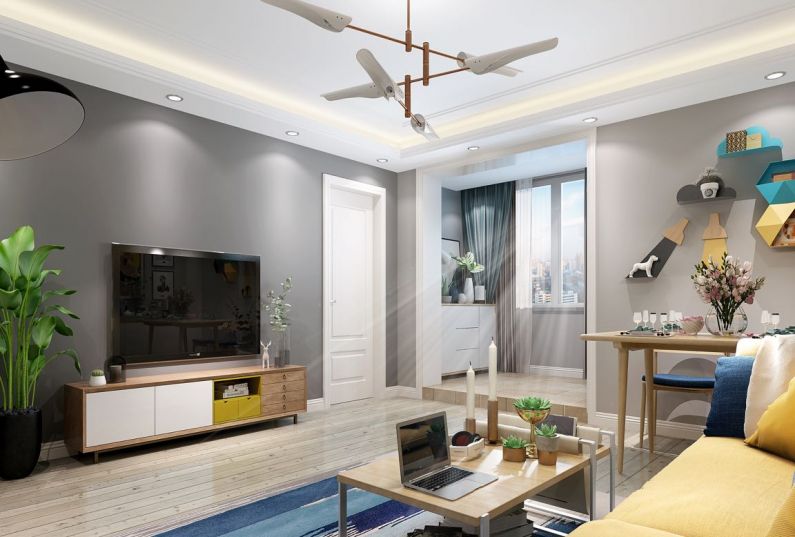 客厅:大理石纹路地砖与叠层的吊顶上线呼应,沙发背景墙简单干净却不缺乏设计感。开放式的餐厨一体,让动线更加流畅,使空间更合理利用。直接提高了空间的实用性。
