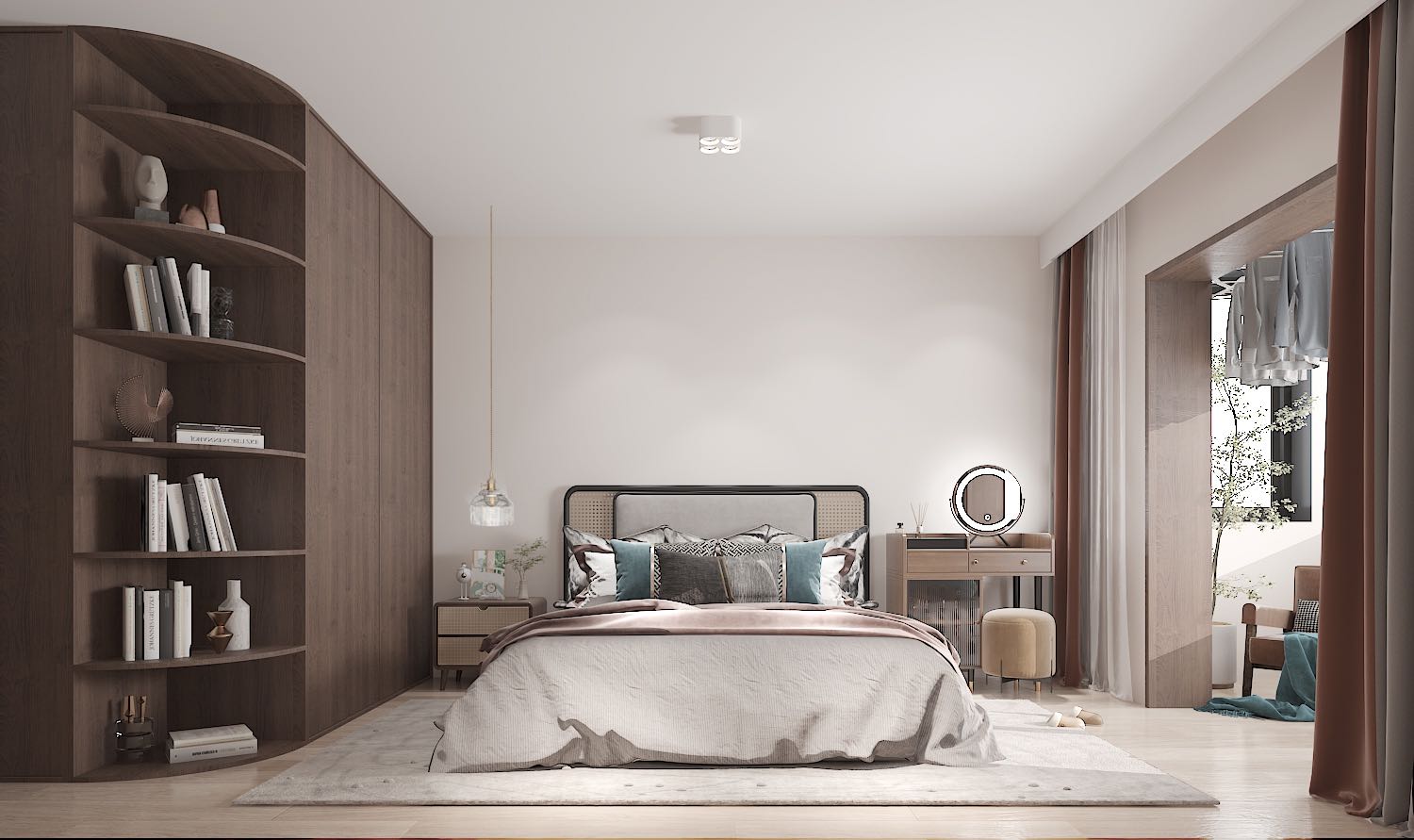 适当运用圆弧门头可一改直线的单一,更有侘寂的原始主张。墙面部分着色,打破对称设计的陈规,更显新意。
