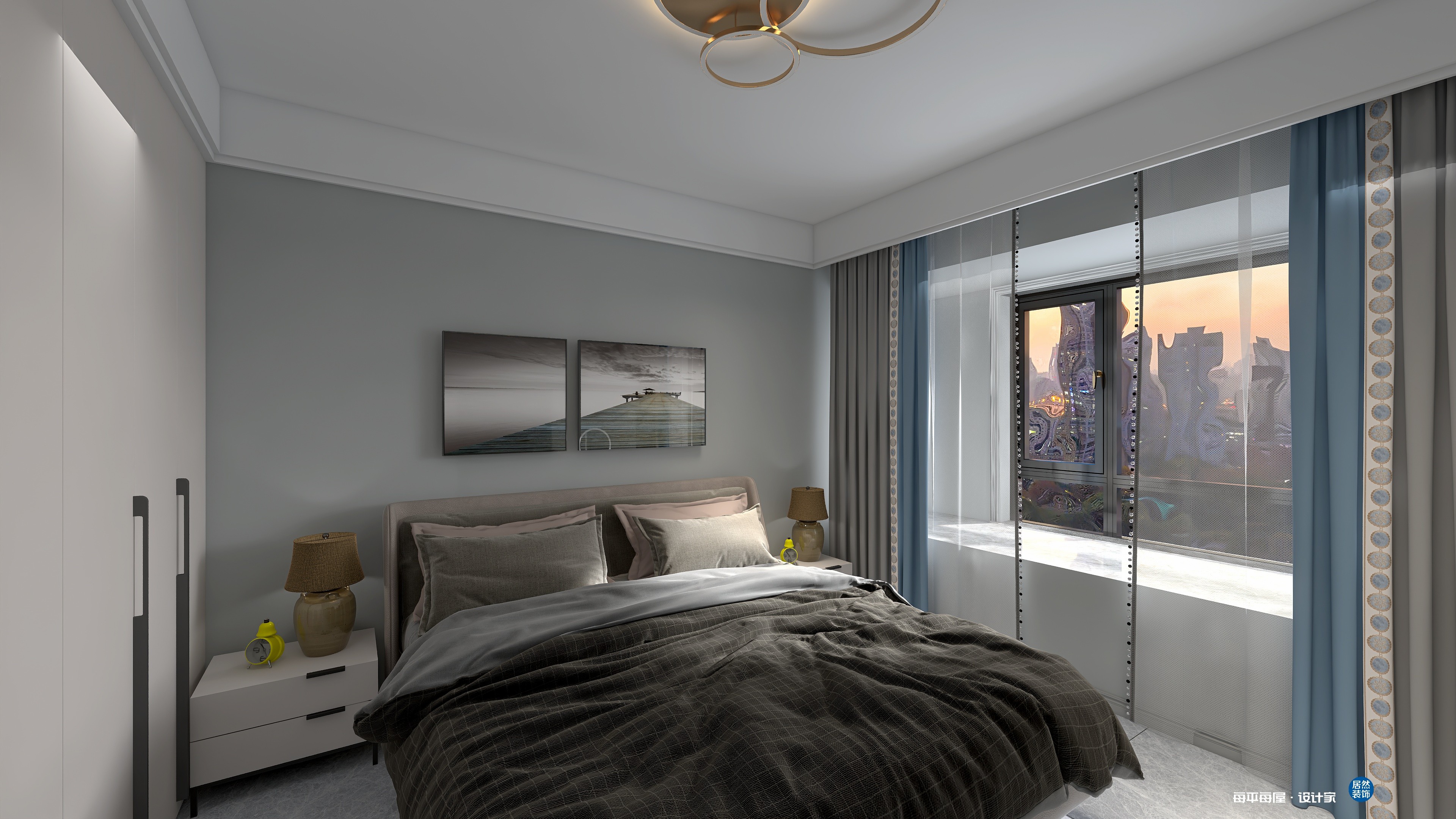 主卧:主卧删繁就简,干净利落,回归到居住本身,让各个元素能协调一致,创造出静谧安宁的氛围。舒适与尺度感并存,慵懒蓬松的面料质感,抹去疲惫与烦闷,增加空间包容性。