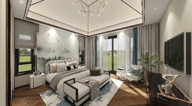 主卧室及书房在原坡顶的基础上加以发挥修正,金属条镶嵌转折板面位置,让顶部线条骨感明显,简洁大气。背景墙简洁中式造型衬云梦、丛林飞鸟,自然意境。