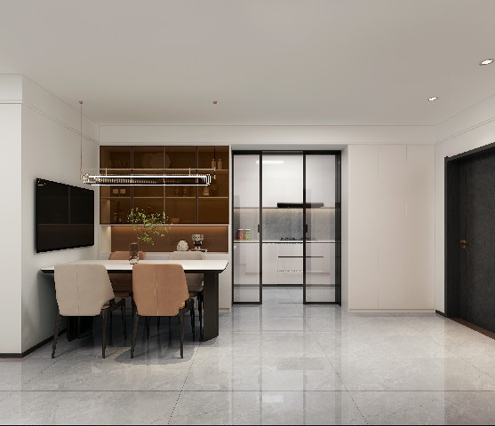 厨房:厨房整个空间的柜子均采用烤漆门板,视觉上干净整洁,方便打理,加上一门到顶隐藏式黑色金属推拉门,增加装饰线条感。