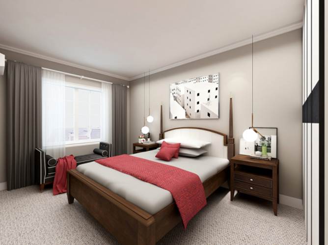 实木床和床头柜给卧室奠定了温暖安心的基调,红色靠包、披拂和床品的注入,将一室的热情点燃。后现代风格装饰画、现代风格的床头吊灯,恰到好处地相辅相成。