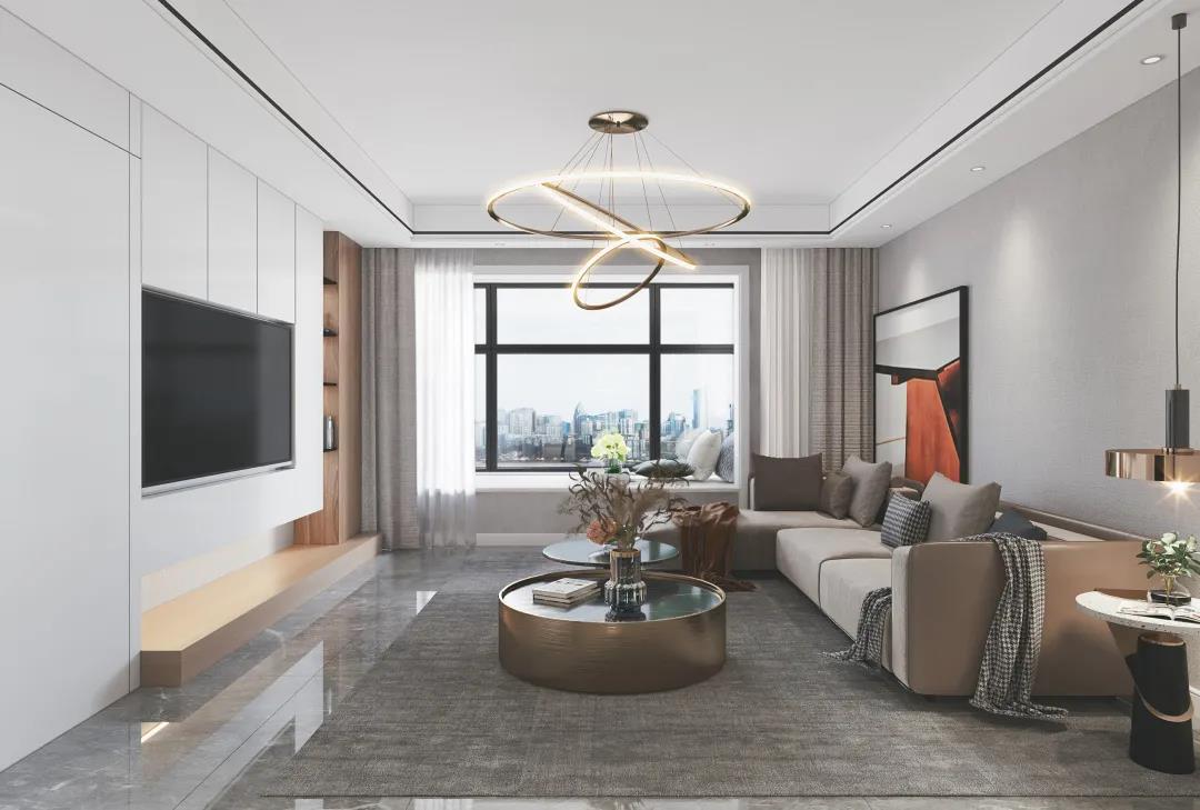 业主喜爱的轻奢风格融合了利落时尚的现代感,营造出舒适又个性的居家空间。岸芷汀兰,郁郁青青。客厅以灰蓝色为主,非常耐看,搭配着温润色度的家具;中间摆放金属质感与深灰色石材的茶几,呼应整个空间,金色的线条设计又让空间略显轻奢。电视墙与次卧的门做对称设计,既隐形又美观。橘色的装饰画是整个中间的点睛之色,让整个空间一下活跃起来。