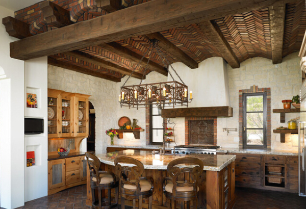 不论怎么说,白色是西班牙建筑必不可少的色彩元素,石头做成的天花板有着独具一格的风味,也散发着最纯正的西班牙的味道,浓浓的古典韵味,套用现在很流行的一句话:可以,这很西班牙。整体的主色调也偏向于原始的深木色,包括厨房橱柜的选择也是一木质为主,椅子靠背的花纹设计也不同寻常,复古的吊灯刚好照亮整个餐桌,暖暖的色调,如此,再来一份西班牙式的料理,难道还谈不上是一次完美的体验吗?