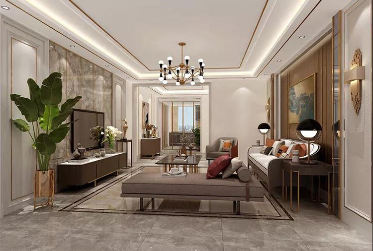 设计师为这套房子赋予了现代轻奢的基调,现代轻奢风格在硬装时通常运用铜条、大理石等精致元素来体现,搭配软装的高级材质如皮革、丝绒、金属等,营造出低调、奢华的气质。