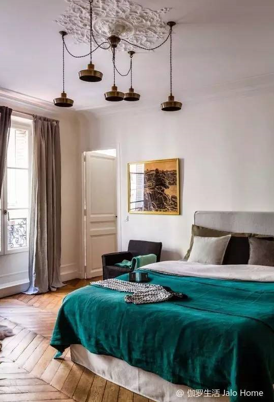 亚麻窗帘、简约样式的床和沙发,都属于现代风格的卧室,因为人字拼地板、石膏雕花灯盘、铜灯、床上的丝绒毯而有了复古的味道。