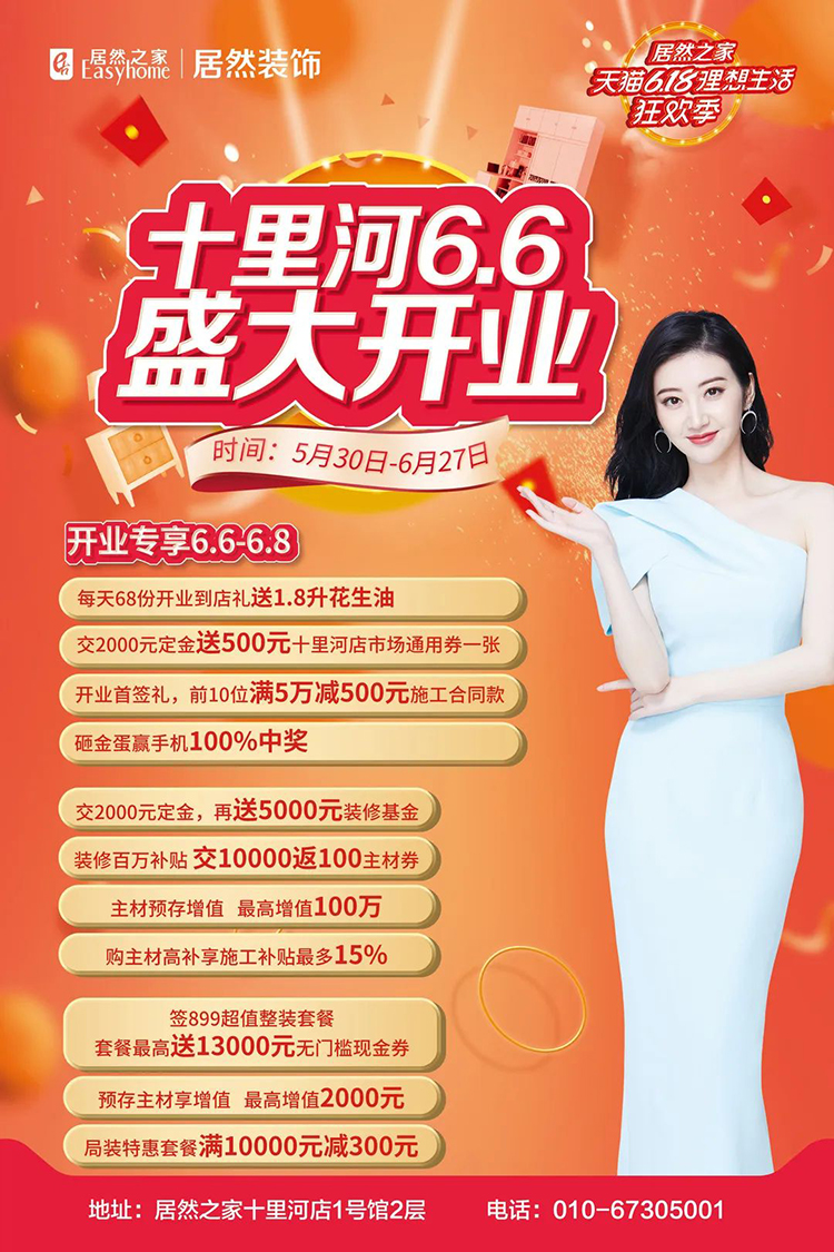 6月6日-8日,十里河店开业活动期间,交2000元装饰定金再送500元十里河店市场通用券。