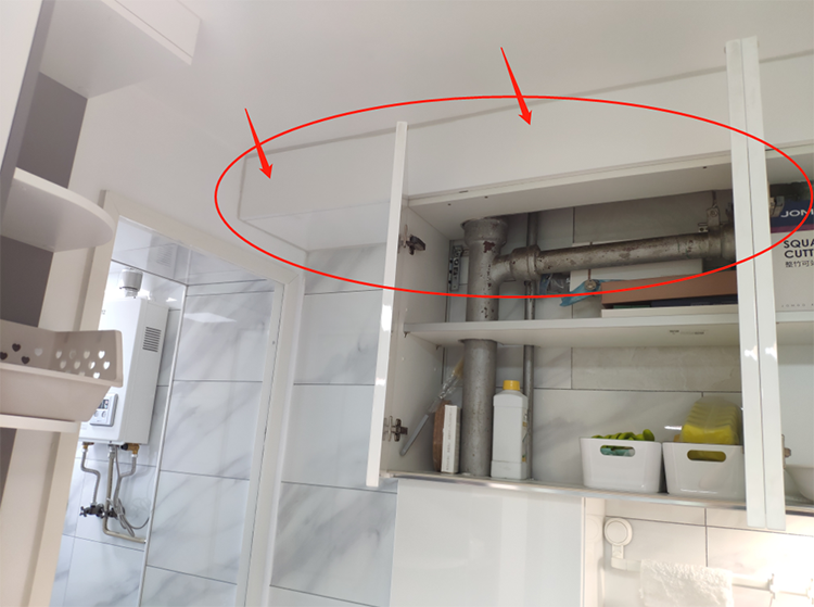为了充分利用每一寸空间,特别定制的异形浴室柜,边边角角也不放过,沿着下水道包管做的浴室柜,严丝合缝。