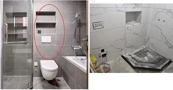 壁挂马桶墙面做壁龛:壁挂马桶假墙厚度在25cm左右,非常适合做壁龛。左图是非常常见的情况,在壁挂马桶的假墙上面做壁龛;右图这位客户是大户型,三个卫生间中的一个客卫。壁挂马桶砌了假墙后,右边淋浴区不一起砌墙,这个地方会出现凹凸棱角,看上去不美观,因此假墙延续到了淋浴区,这样在淋浴区正好可以掏出一个壁龛,放置洗漱用品。